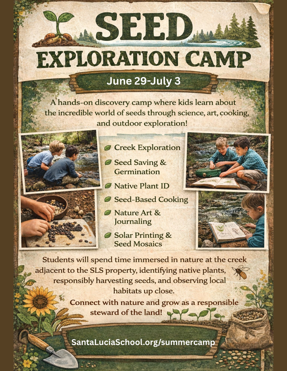 Students will spend time immersed in nature at the creek adjacent to the SLS property, identifying native plants, responsibly harvesting seeds, and observing local habitats up close. Each day includes community circles, collaborative activities, and reflective closing time—helping children build observation skills, stewardship, teamwork, and a deeper connection to the natural world.